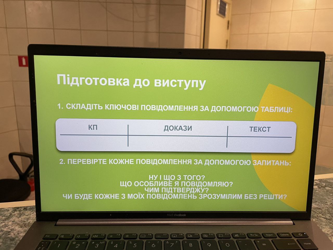 Тренінг супроводжувався демонстрацією віжуалів, панельними дискусіями, тестами, а також відповідями на практичні завдання. Зокрема, відомий тележурналіст, ведучий інформаційного марафону «Єдині новини» Олексій Фадєєв надав цінні рекомендації щодо ефективного спілкування із медіа та разом з оператором втілив їх у життя – кожен з учасників тренінгу зміг спробувати себе у ролі телеведучого у плані донесення доступної інформації до цільової аудиторії.