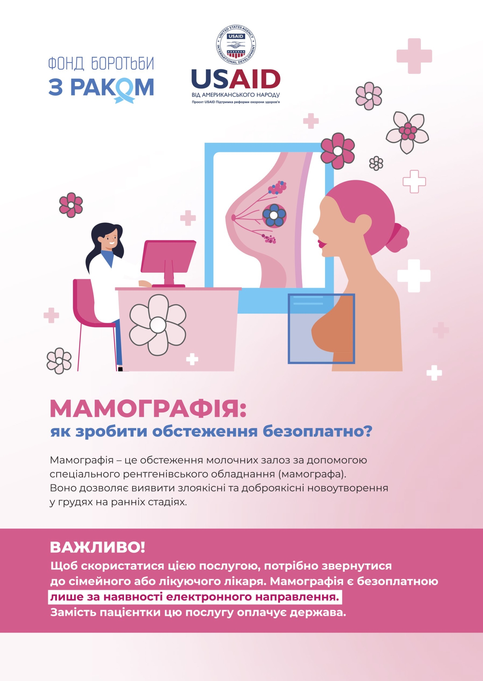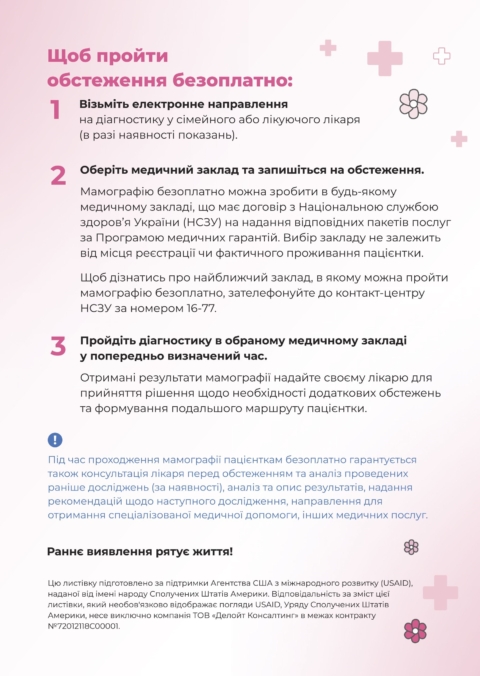 Для того, аби безоплатно зробити мамографію, треба взяти направлення у сімейного лікаря та записатися на обстеження у тому медичному закладі, який надає таку послугу і відповідає вимогам Національної служби здоров’я України. Щоб дізнатись про найближчий заклад, зателефонуйте до контакт-центру НСЗУ за номером 16-77.